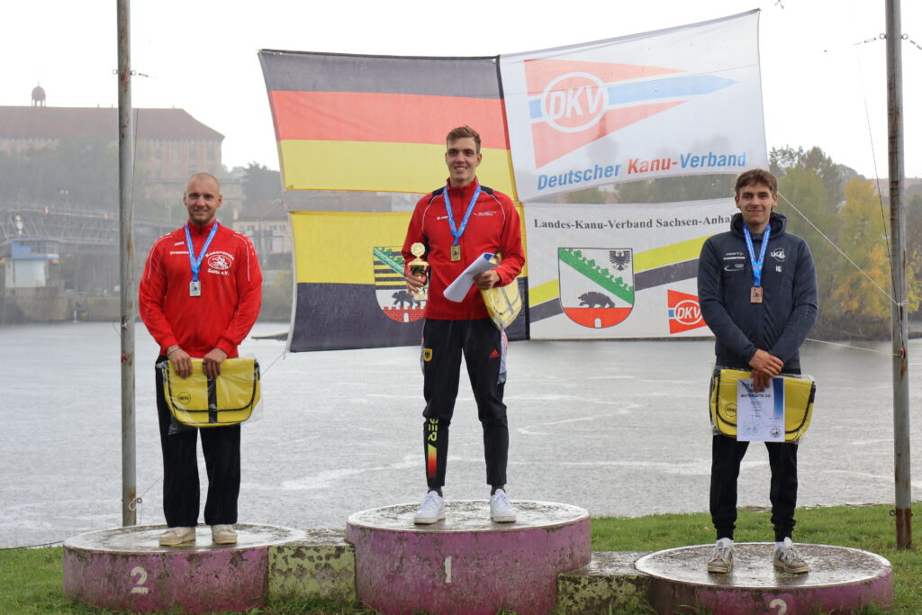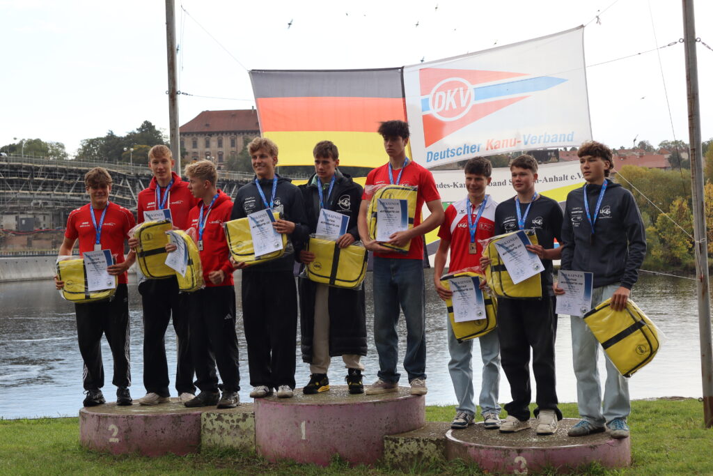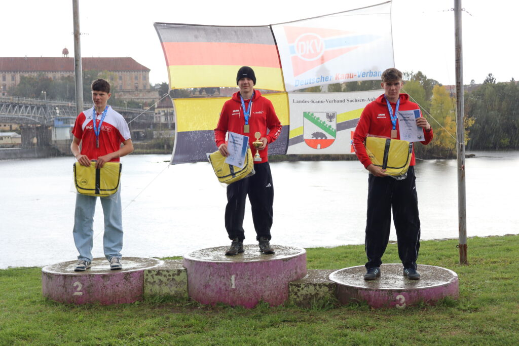 Gleich der Samstagmorgen startete mit einer Goldmedaille, drei Silbermedaillen und einer Bronzemedaille in den Mannschaftsrennen. Benjamin Kies sicherte sich an der Seite der Zeitzer Hannes und Timo Trummer den Meistertitel in der Kategorie 3xC1 Männer. Als reines BSV-Team holten Pascal Brandenburg, Zacharias Bone und Kjell Kadyck im Rennen 3xC1 in der U18 Silber. Dieselbe Medaillenfarbe gab es in der Kategorie 3xC1 der Damen für Charlotte Wild, Mina Blume und Claire Harlak. Ebenfalls Silber gewannen Mina und Charlotte gemeinsam mit Hannah Tschiedel (Zeitz) im Rennen 3xK1 Damen. Den Medaillensatz komplett machten Jonas Hoske und Albert Sacher als Renngemeinschaft Sachsen-Anhalt mit David Pestel (Zeitz) im 3xK1 U18 mit dem 3. Platz.
